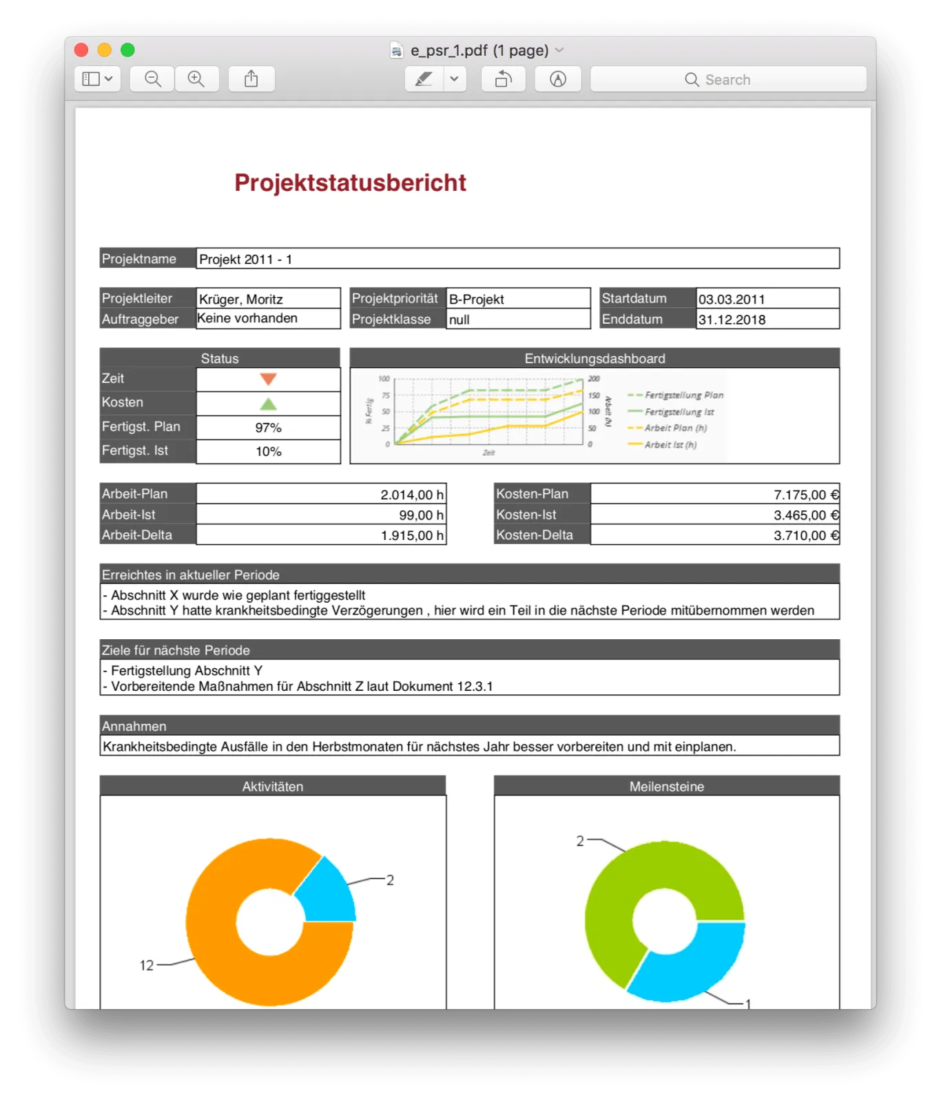 Kosten: Um eine knappe Info zum Budget weitergeben zu können, stellt ihr einfach die geplanten Kosten aller Aktivitäten bis zum Berichtszeitraum den tatsächlich angefallenen Kosten gegenüber.