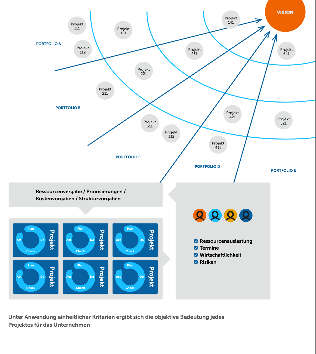 Somit hilft das Projektportfoliomanagement einerseits dabei, einen Überblick zu erhalten, in welche Richtung ein Unternehmen mit seinem Projektportfolio steuert. Die einheitliche und vor allem objektive Beurteilung und Priorisierung von Projekten erübrigt aber auch Diskussionen darüber, ob und in welchem Maße Projekten Ressourcen zugeteilt werden.