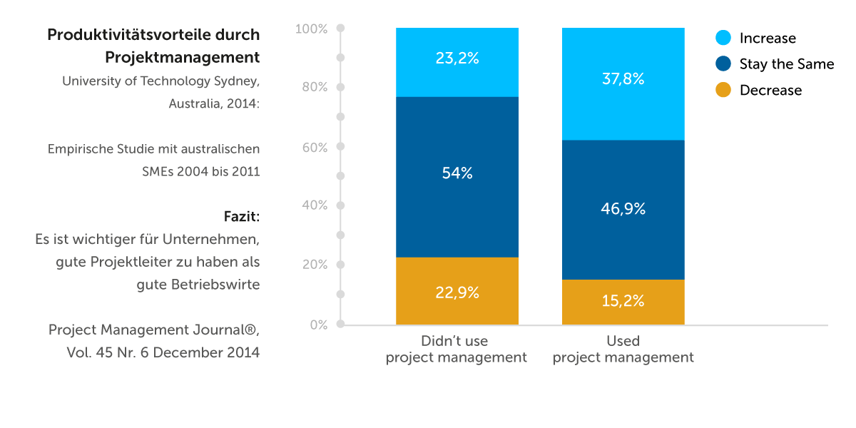 Viele Studien zeigen jedoch, dass ein professionelles Projektmanagement wahre Produktivitätsvorteile birgt und deswegen sämtliche Aufmerksamkeit verdient hätte. Als Beispiel soll hier eine empirische Studie aus Australien dienen, die 2004 bis 2011 bei kleinen und mittelständischen Unternehmen durchgeführt wurde.