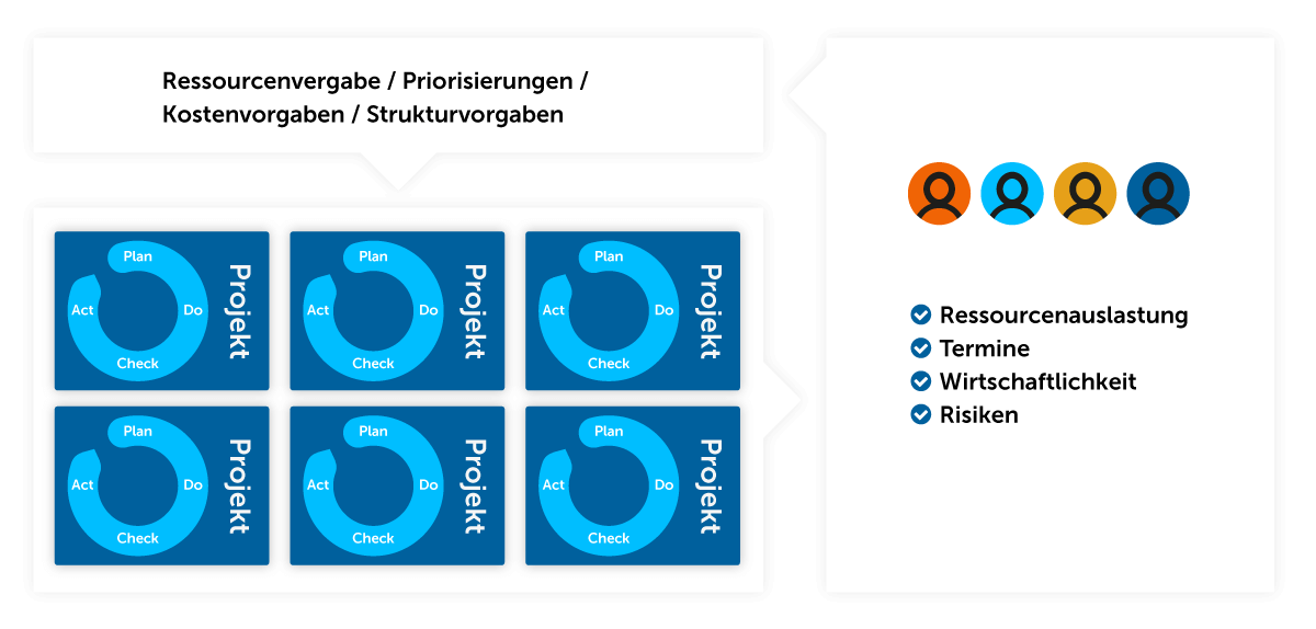 Dabei muss abgesteckt werden, wie viele Regeln erforderlich sind und welche Freiheitsgrade möglich sind. Es gilt, einen Projektmanagement-Rahmen zu definieren und damit eine Grundlage zu schaffen. Dazu zählt das Ressourcen-Management, aber auch die Methodik, die Planung, die Steuerung, die Beschäftigung mit Risiken, Kosten und Prioritäten. Nur wenn die Rahmenbedingungen stimmen und der Output von Ressourcenauslastung, Terminen, Wirtschaftlichkeit und Risiken an ein Ressourcen-Management übermittelt werden, können Projekte erfolgreich bewältigt werden.