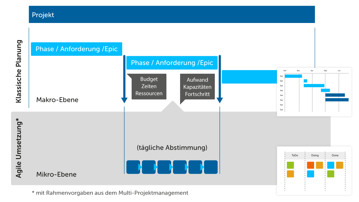 Doch darüber hinaus sind strategische Rahmen sehr hilfreich. Bestimmte Anforderungen an Projekte müssen mit Budgets, Zeitvorgaben und Ressourcen ausstaffiert werden – damit die Mikro-Ebene diese dann bei der Umsetzung nutzen kann. Es entsteht hier eine kleine Art „Gegengeschäft“: Meldet die Mikro-Ebene, was sie wirklich von der vorgebebenen Zeit und dem definierten Budget gebraucht hat, hilft das dem Ressourcen-Management in der Planung der Gesamtprojektlandschaft.