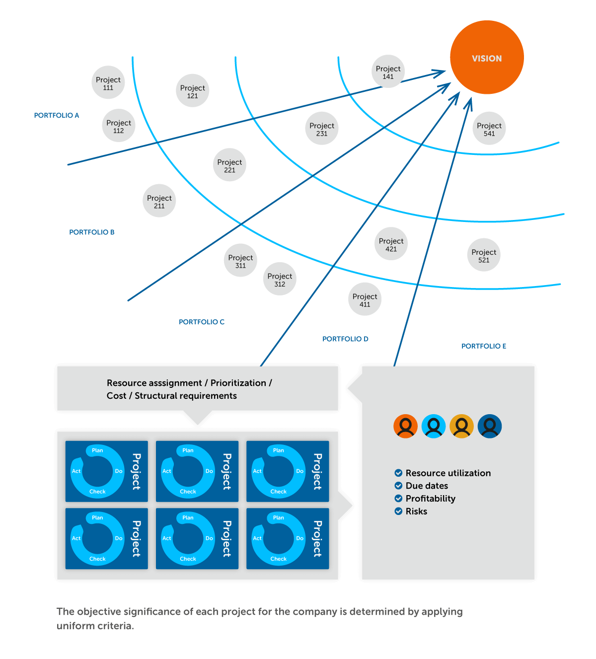 PPM enables you to consistently implement important strategic decisions in your company through the correct and targeted use of resources and financial means. This gives rise to a basic condition: at least one person must have a complete overview of the project portfolio and be able to decide which projects promise success.