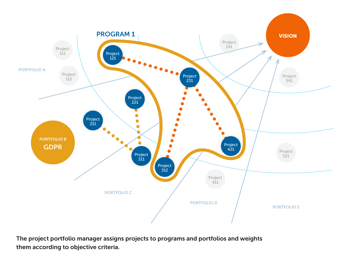 Example: Digitization and all the associated changes require a wide variety of projects and measures in different fields of action. In their entirety, a wide variety of programs pursue the strategic goal of meeting the market changes resulting from digital transformation. There is neither a deadline for this nor a specific common goal that all projects are working towards.